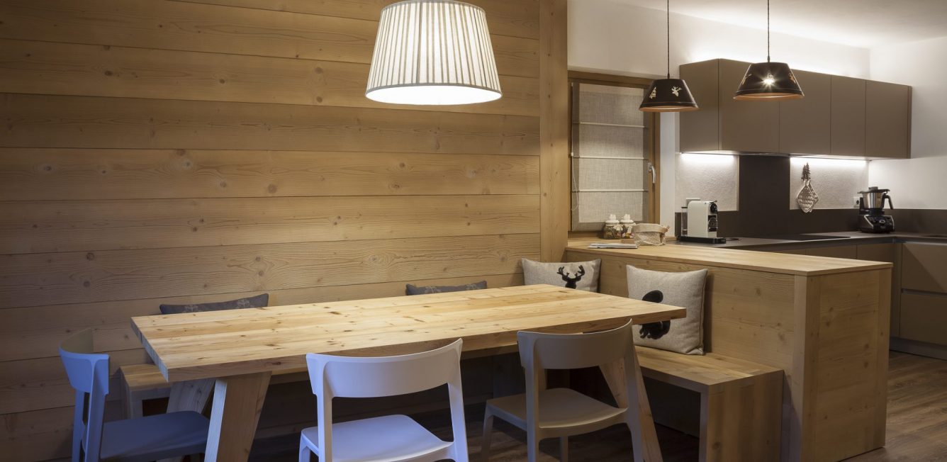 Per rivestimenti e arredi, abbiamo utilizzato abete spazzolato abbinato a elementi dal design moderno: il laccato bianco lucido dell’armadio della camera e il marmo scuro della cucina si sposano benissimo con il carattere rustico del legno, creando una raffinata fusione di stili.