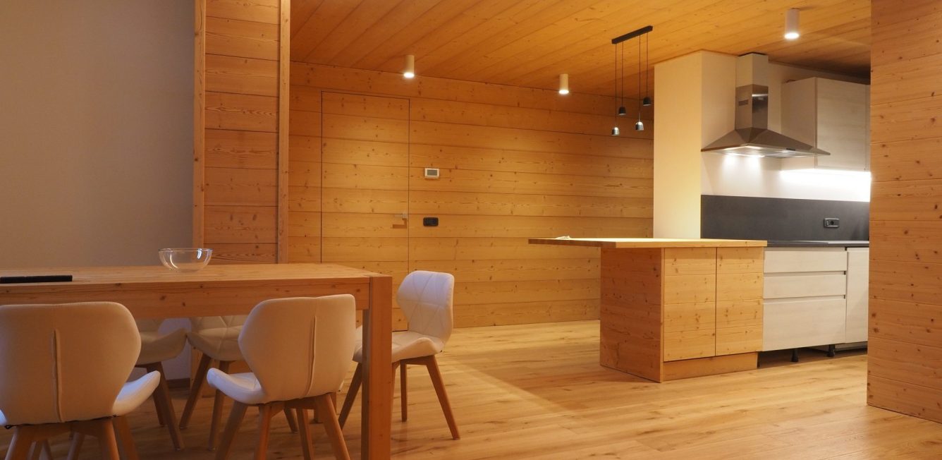 Abbiamo completamente rivisto la pianta, con l’abbattimento delle pareti divisorie in muratura per ridistribuire gli spazi. Abbiamo poi progettato un arredamento su misura, utilizzando il legno sia per i mobili che per i rivestimenti delle pareti, con luci integrate nel controsoffitto. Il legno impiegato è abete evaporato naturale a doghe, mentre il pavimento è in parquet di rovere.