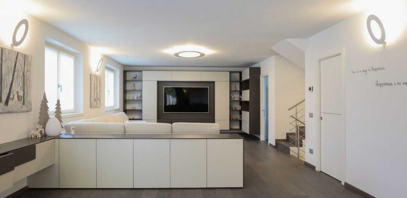 Una villetta residenziale sviluppata su due piani, con ampia zona giorno e cucina al primo piano e zona notte con 4 camere e 3 bagni al secondo. In collaborazione con l’architetto di fiducia del cliente, abbiamo progettato gli arredi degli spazi interni, con cucina moderna*. Dal soggiorno alla cucina, dalle camere ai bagni, i mobili sono della medesima linea: design pulito a moduli rettangolari, palette bicromatica bianco-marrone, finitura opaca. Per un risultato armonico, abbiamo proposto dei divani bianchi dalla linea essenziale con piedini in metallo.