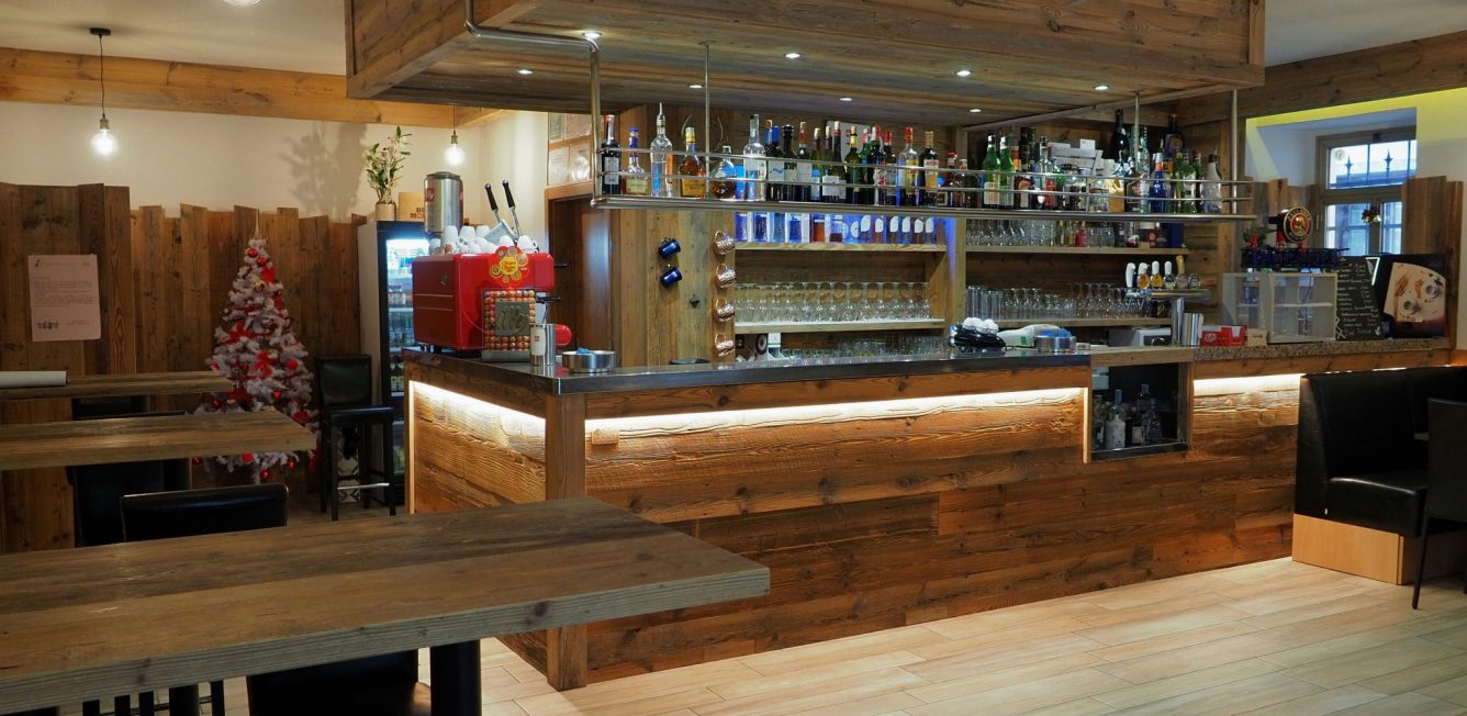 Il bar Ancora di Giustino, in Val Rendena, era un locale datato. Preso in gestione da un giovane imprenditore con l’intenzione di trasformarlo in bar per giovani, aveva bisogno di essere rivisitato nell’arredo. Il materiale scelto è abete vecchio prima patina, un legno di pregio che si presta bene anche a stili moderni. Per un look più fresco, abbiamo sostituito i vecchi giropanca con sgabelli e tavolini rialzati con piano in legno che si abbina ai rivestimenti a parete. Per sfruttare uno spazio ad angolo, abbiamo inserito un tavolo basso in melaminico con seduta angolare. Per rinnovare il bancone del bar, siamo partiti dal telaio del bancone esistente e abbiamo rivestito la struttura con un lavoro di falegnameria, integrando anche le luci.